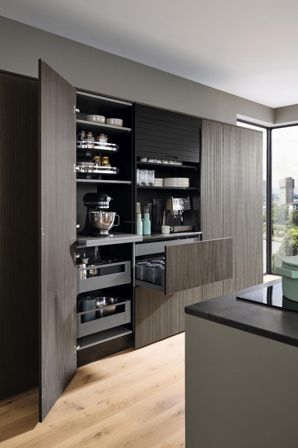 Diese Küche hat trotz der einfachen und klar strukturierten Planung eine starke optische Ausstrahlung. Die Rillenstrukturen der dunkel gebeizten Eiche sind optisch und haptisch ein Genuss. Der Jalousieschrank fügt sich mit seiner eleganten Linienführung perfekt ein. Er bietet genug Platz für eine Kaffeebar. Ein Tablar gleich daneben schafft eine weitere Arbeitsfläche. Das TurnMotion darüber bietet Stauraum.